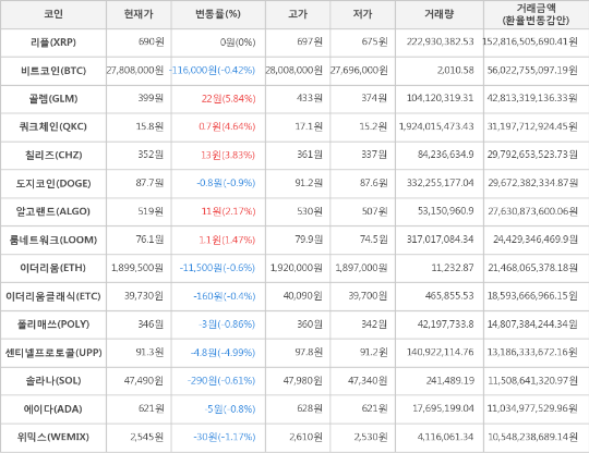 가상화폐 시세 (제공: 암호화폐 거래소 업비트)현재 암호화폐 거래소 "업비트"에 따르면 가상화폐 대장 격인 비트코인의 시세는 전일 대비 -116,000원(-0.42%) 하락한 27,808,000원에 거래되고 있다.