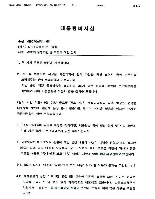 저는 이 장면을 보고 어안이 벙벙했습니다. 자신의 욕설과 비속어에 대해서는 답변을 회피하고 엉뚱하게 언론의 동맹 훼손 사건으로 몰아간 것입니다. 그리고 그날 대통령 비서실은 <문화방송>(MBC)에 보도 경위를 따져 묻는 공문을 보냈습니다. 제가 기자를 꽤 오래 했지만, 대통령 관련 보도에 대해 대통령 비서실에서 방송사 사장에게 직접 공문을 보내 보도 경위를 추궁하는 것은 처음 봤습니다.
