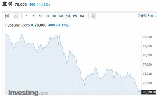 ◇87세 회장님도 ‘매수’···3개월 간 28번 산 오너도=효성(004800)그룹은 명예회장을 비롯해 오너 일가가 그룹사 주식을 대거 매입하고 있어 배경에 관심이 쏠린다. 금융감독원 전자공시시스템에 따르면 조석래 명예회장은 이달 6일부터 14일까지 지주사 ㈜효성 주식 3900주를 장내매수했다. 평균 매입단가는 7만3815원으로 총 투자금은 2억8769만원이다. 조 명예회장의 ㈜효성 지분율은 9.64%에서 9.66%로 증가했다. 조 명예회장은 또 15~19일에는 효성화학(298000) 주식 1130주를 매입했다. 취득 단가는 평균 16만4813원으로 매입 총액은 1억8586억 원이다. 지분율 역시 7%에서 7.03%로 소폭 변동했다. 효성의 주가는 올해 1월 9만6000원 수준이었는데 조 명예회장이 매입한 이달에는 7만원 대를 기록 중이다. 연초 대비로는 약 27% 가량 급락한 상황. 효성화학은 주당 35만원 대에서 10만원대로 3분의 1토막이 났다. 조 명예회장의 손주들도 지분을 매입 중이다.