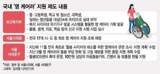 서울시도 올해 말까지 서울에 거주하는 14~34세 영 케어러에 대한 실태조사 용역을 진행한다. △영 케어러 현황(연령별 분포, 가구형태 등) 및 특성 비교 △유형별 전수조사를 통한 실태조사 및 정책 수요 분석 △영 케어러 정책 개발을 위한 정책 방향 설정 등을 목표로 한다. 서울시의회도 최근 전국 17개 특광역시·도 중에서는 처음으로 14세 이상 34세 이하의 영 케어러를 지원하기 위한 조례를 만들었다.