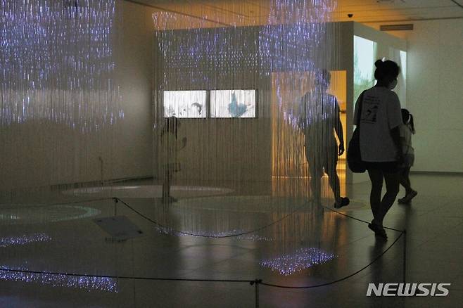 [제주=뉴시스] 양영전 기자 = 제주에서 2022 세계유산축전이 열리고 있는 가운데 2일 오후 제주시 조천읍 세계자연유산센터를 찾은 관람객들이 '태초의 빛과 색 제주' 특별전을 관람하고 있다. 2022.10.02. 0jeoni@newsis.com