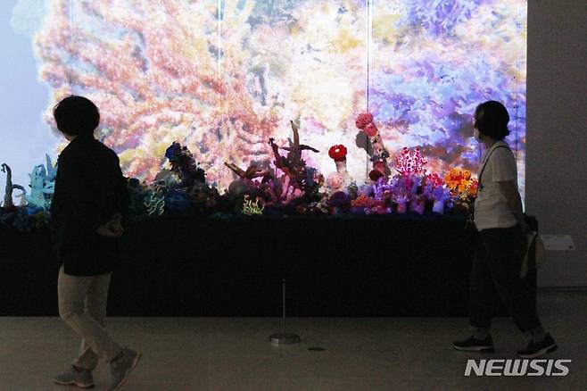 [제주=뉴시스] 양영전 기자 = 제주에서 2022 세계유산축전이 열리고 있는 가운데 2일 오후 제주시 조천읍 세계자연유산센터를 찾은 관람객들이 '태초의 빛과 색 제주' 특별전을 관람하고 있다. 2022.10.02. 0jeoni@newsis.com