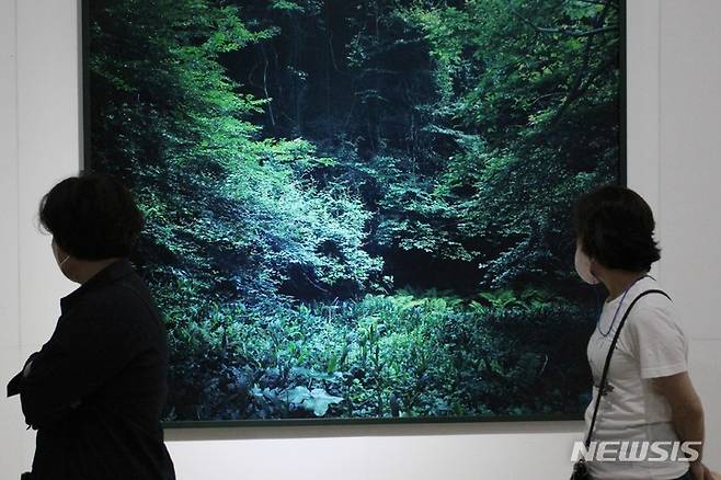 [제주=뉴시스] 양영전 기자 = 제주에서 2022 세계유산축전이 열리고 있는 가운데 2일 오후 제주시 조천읍 세계자연유산센터를 찾은 관람객들이 '태초의 빛과 색 제주' 특별전을 관람하고 있다. 2022.10.02. 0jeoni@newsis.com