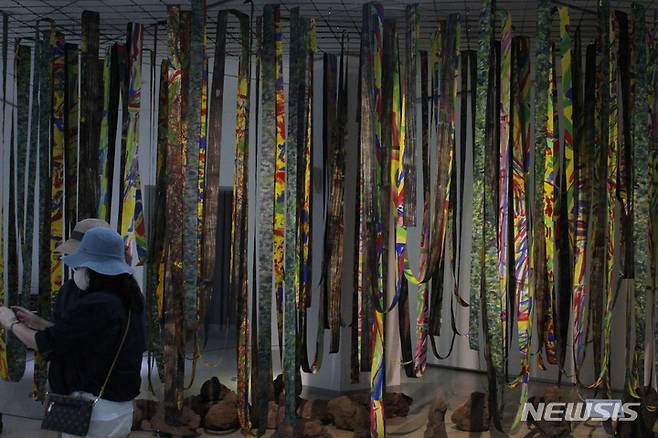 [제주=뉴시스] 양영전 기자 = 제주에서 2022 세계유산축전이 열리고 있는 가운데 2일 오후 제주시 조천읍 세계자연유산센터를 찾은 관람객들이 '태초의 빛과 색 제주' 특별전을 관람하고 있다. 2022.10.02. 0jeoni@newsis.com