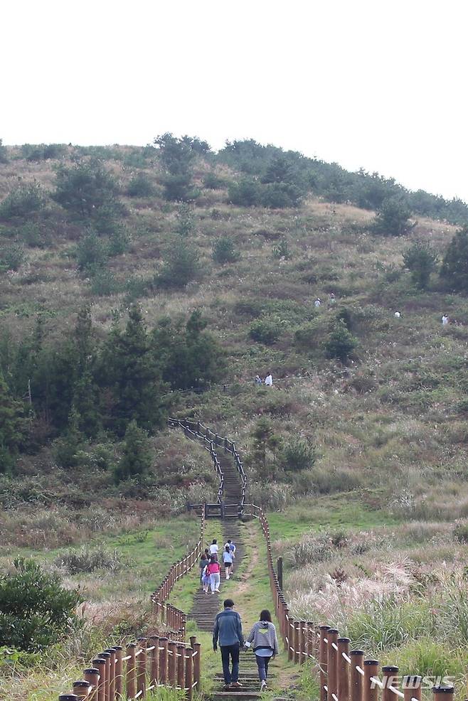 [서귀포=뉴시스] 양영전 기자 = 개천절 연휴 이틀째인 2일 오후 서귀포시 표선면 백약이오름을 찾은 나들이객들이 제주의 가을 정취를 즐기고 있다. 2022.10.02. 0jeoni@newsis.com