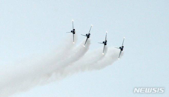 [김제=뉴시스] 김얼 기자 = 블랙이글스 관계자들이 2일 전북 김제시 심포항에서 제24회 김제지평선축제를 축하하기 위해 에어쇼를 펼치고 있다. 2022.10.02. pmkeul@newsis.com