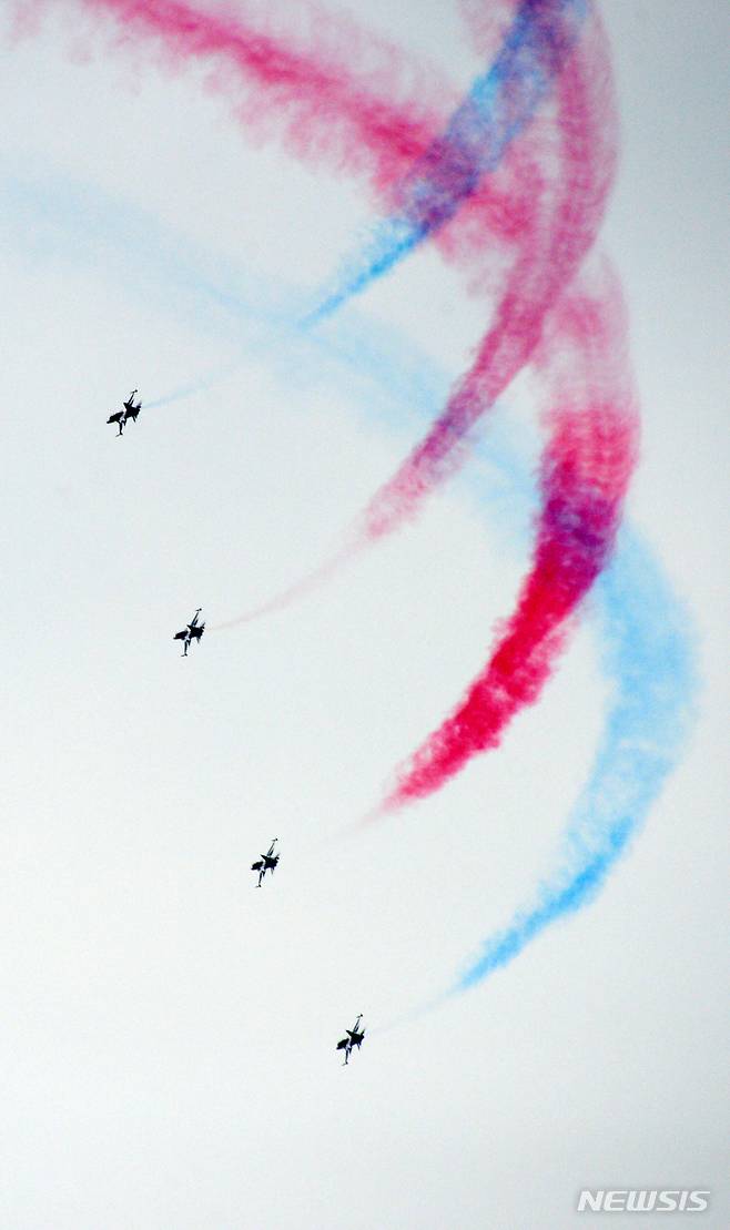 [김제=뉴시스] 김얼 기자 = 블랙이글스 관계자들이 2일 전북 김제시 심포항에서 제24회 김제지평선축제를 축하하기 위해 에어쇼를 펼치고 있다. 2022.10.02. pmkeul@newsis.com