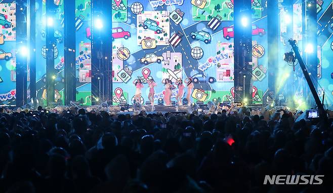 [서울=뉴시스] 이영환 기자 = 2일 오후 서울 강남구 코엑스 앞 영동대로 특설무대에서 열린 2022 영동대로 K-POP 콘서트에서 위클리가 공연을 펼치고 있다. 2022.10.02. 20hwan@newsis.com