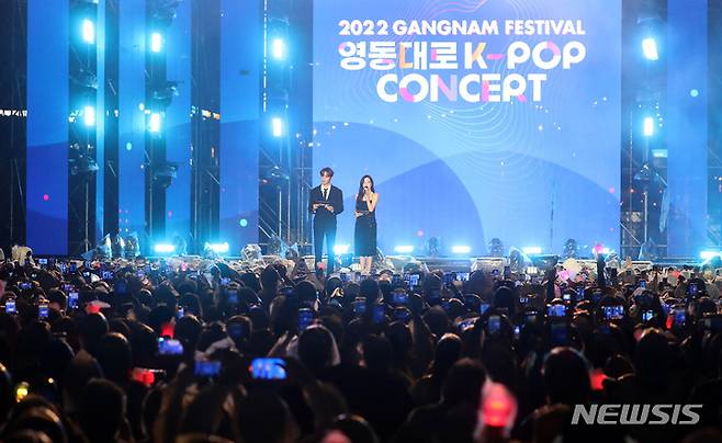 [서울=뉴시스] 이영환 기자 = 소녀시대 티파니와 더보이즈 현재가 2일 오후 서울 강남구 코엑스 앞 영동대로 특설무대에서 열린 2022 영동대로 K-POP 콘서트에서 사회를 보고 있다. 2022.10.02. 20hwan@newsis.com