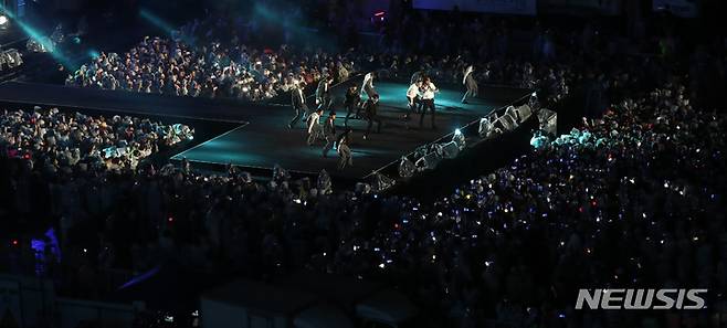 [서울=뉴시스] 이영환 기자 = 2일 오후 서울 강남구 코엑스 앞 영동대로 특설무대에서 열린 2022 영동대로 K-POP 콘서트에서 하이라이트가 공연을 펼치고 있다. 2022.10.02. 20hwan@newsis.com