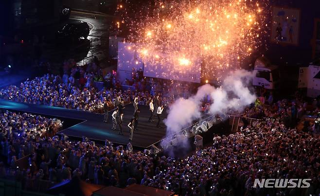 [서울=뉴시스] 이영환 기자 = 2일 오후 서울 강남구 코엑스 앞 영동대로 특설무대에서 열린 2022 영동대로 K-POP 콘서트에서 하이라이트가 공연을 펼치고 있다. 2022.10.02. 20hwan@newsis.com