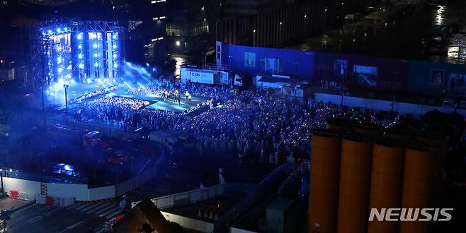 [서울=뉴시스] 이영환 기자 = 2일 오후 서울 강남구 코엑스 앞 영동대로 특설무대에서 열린 2022 영동대로 K-POP 콘서트에서 하이라이트가 공연을 펼치고 있다. 2022.10.02. 20hwan@newsis.com