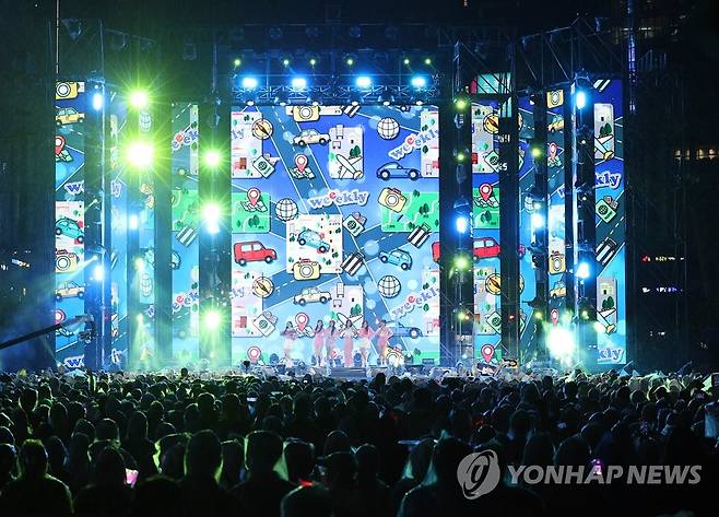 (서울=연합뉴스) 이지은 기자 = 2일 오후 서울 강남구 영동대로에서 열린 한류 콘서트 '영동대로 K-팝 콘서트'에서 그룹 위클리가 공연을 펼치고 있다. 이날 콘서트에는 싸이를 비롯해 더보이즈, 하이라이트, 청하, 위클리 등 한류스타들이 출연한다. 2022.10.2