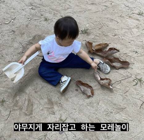 사진에는 공원의 모래 바닥에 철푸덕 앉아 삽을 가지고 모래로 장난을 치는 한지혜 딸의 모습이 담겼다.