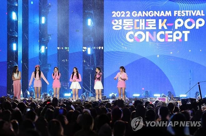 (서울=연합뉴스) 이지은 기자 = 2일 오후 서울 강남구 영동대로에서 열린 한류 콘서트 '영동대로 K-팝 콘서트'에서 그룹 위클리가 무대인사를 하고 있다. 이날 콘서트에는 싸이를 비롯해 더보이즈, 하이라이트, 청하, 위클리 등 한류스타들이 출연한다. 2022.10.2