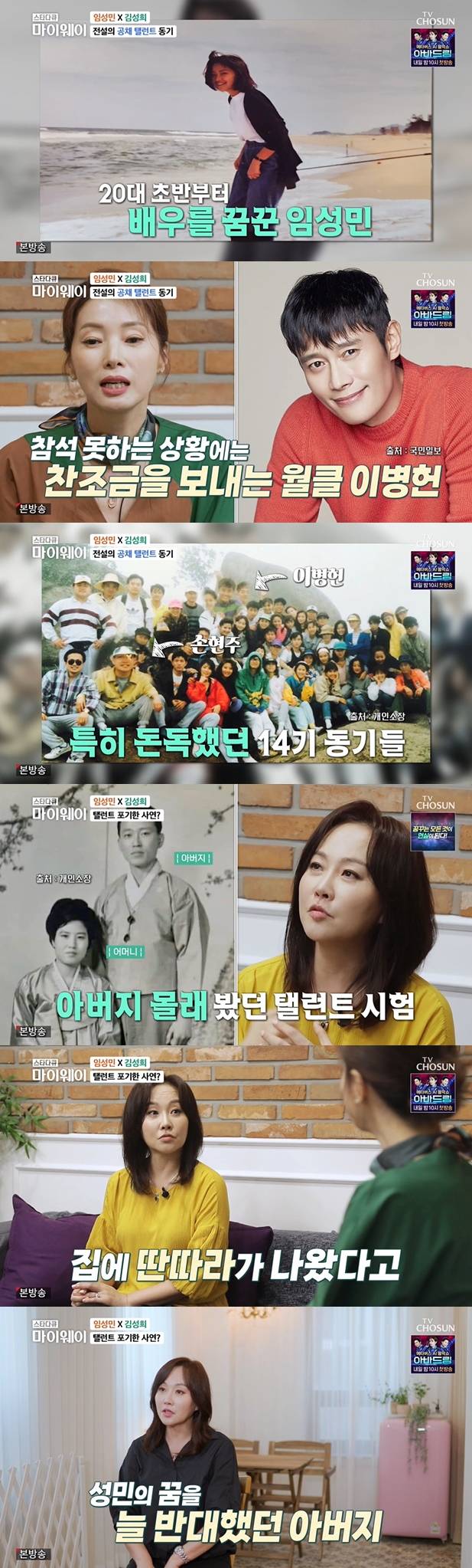 임성민은 "이응진 감독님이 저희를 뽑지 않았나. '아버지가 반대해서 못 나갈 것 같다'고 하니까 '주말 드라마 들어가는데 딱 어울리는 역이 있다. 캐스팅을 생각하고 뽑았으니까 꼭 해라. 앞으로 연기자가 최고의 직업이 될 거다'라고 했다. 그래도 못 했다"라고 비하인드를 밝혔다.