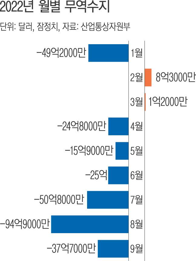 15대 주요 품목 중 석유제품, 자동차, 2차전지 등 5개 품목만 수출이 늘었다. 특히 최대 품목인 반도체 수출이 전년 대비 5.7% 감소했다. 최대 시장인 중국 수출도 6.5% 줄며 4개월 연속 감소세를 이어갔다. 러시아와 우크라이나 전쟁 장기화로 경기둔화 우려가 확산 중인 유럽연합(EU)에도 수출이 0.7% 줄었다. 반면 지난달 수입액은 전년 대비 18.6%나 늘며 612억3000만달러를 기록했다. 3대 에너지원인 원유·가스·석탄 수입액(179억6000만달러)이 지난해 같은 기간보다 80억5000만달러 급증한 영향이 컸다. 특히 지난 1~9월 원유·가스·석탄 수입액이 전년 대비 670억달러나 늘어 무역적자 폭(288억8000만달러)을 크게 웃돌았다.