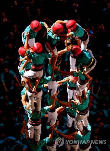 epa10219353 Members of 'Castellers de Vilafranca' team go up to form their 'castell' or human tower during Castells contest's final in Tarragona, Catalonia, Spain, 02 October 2022. The 'castells', human constructions in the form of towers, where each 'casteller' stands on the shoulders of the one below up to a height of between four and ten levels, are included in the list of the Intangible Cultural Heritage of Humanity of the United Nations Educational, Scientific and Cultural Organization (UNESCO). EPA/Enric Fontcuberta