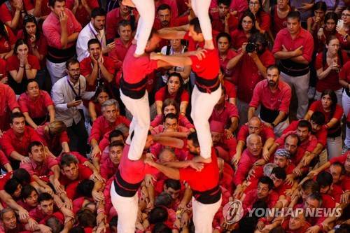 epa10219356 Members of Joves de Valls' Colla team form their 'castell' or human tower during Castells contest's final in Tarragona, Catalonia, Spain, 02 October 2022. The 'castells', human constructions in the form of towers, where each 'casteller' stands on the shoulders of the one below up to a height of between four and ten levels, are included in the list of the Intangible Cultural Heritage of Humanity of the United Nations Educational, Scientific and Cultural Organization (UNESCO). EPA/Enric Fontcuberta