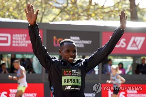 Winner Amos Kipruto of Kenya poses during the trophy presentation for the men's elite race at the London Marathon in London, Sunday, Oct. 2, 2022. (AP Photo/David Cliff)