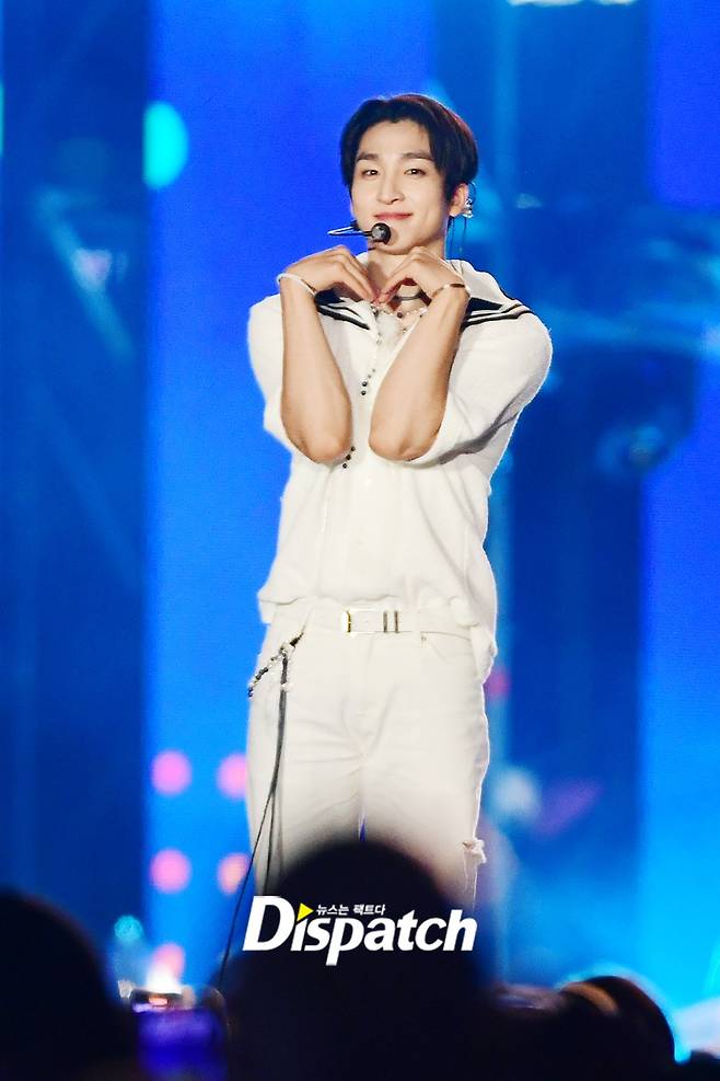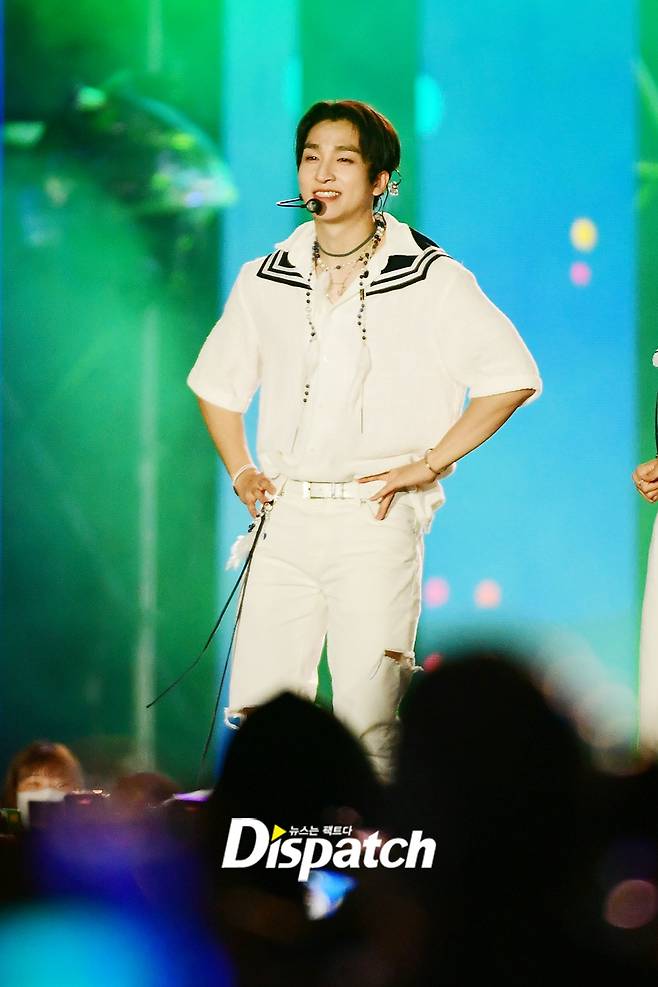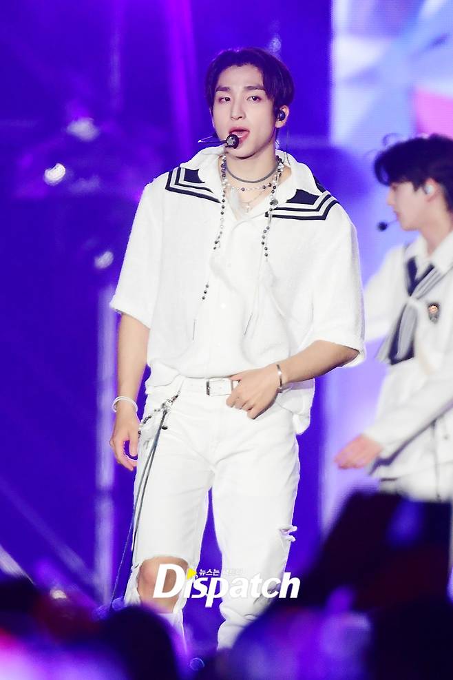 '더보이즈' 상연은 올화이트 의상으로 소년미를 뽐냈다. 뚜렷한 T존이 시선을 끌었다.