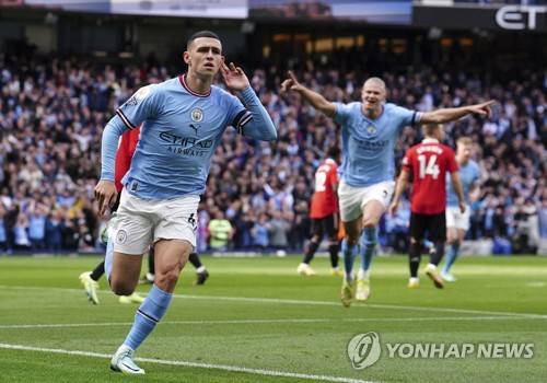 Manchester City's Phil Foden, left, celebrates scoring his side's first goal during the English Premier League soccer match between Manchester City and Manchester United at Etihad stadium in Manchester, England, Sunday, Oct. 2, 2022. (Martin Rickett/PA via AP) UNITED KINGDOM OUT; NO SALES; NO ARCHIVE; PHOTOGRAPH MAY NOT BE STORED OR USED FOR MORE THAN 14 DAYS AFTER THE DAY OF TRANSMISSION; MANDATORY CREDIT