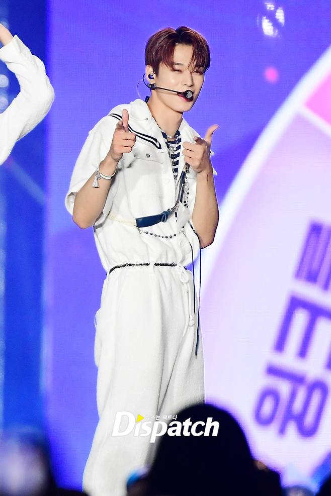 '더보이즈' 주연은 사랑의 총알로 팬서비스를 선보였다. 남다른 팬서비스로 시선을 끌었다.