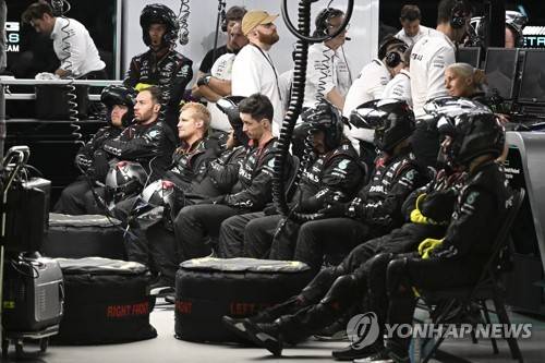 Mechanics for Mercedes driver Lewis Hamilton of Britain watch his race on screens in his team garage during the Singapore Formula One Grand Prix, at the Marina Bay City Circuit in Singapore, Sunday, Oct. 2, 2022. (Mohd Rasfan/Pool photo via AP) POOL PHOTO