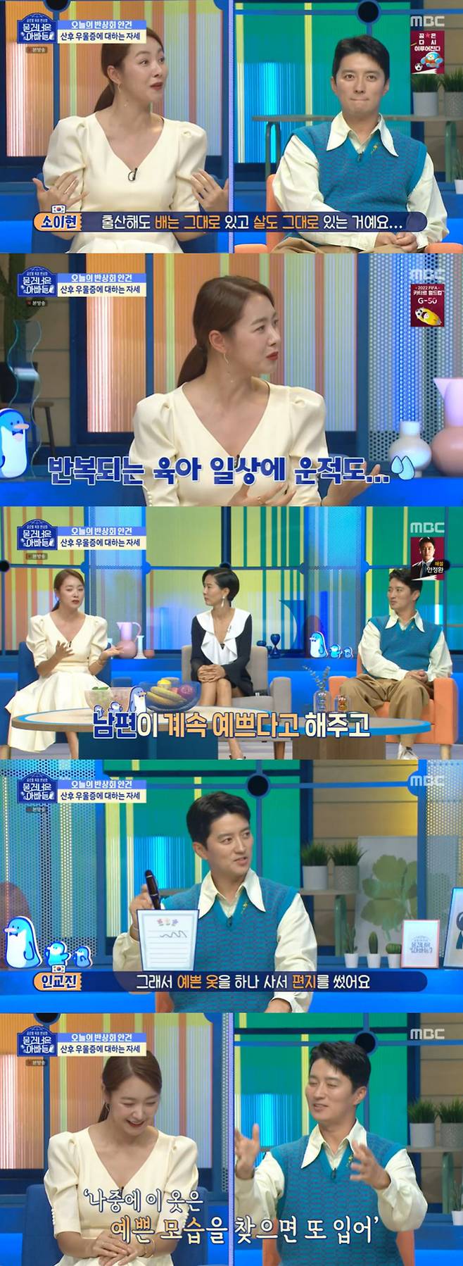 소이현이 산후우울증을 극복할 수 있었던 건 남편 인교진의 도움이었다. 소이현은 "신랑이 계속 예쁘다고 하고 분명 얼굴에 침 자국 있는데도 괜찮다는 말을 해주더라"라고 밝혔다.