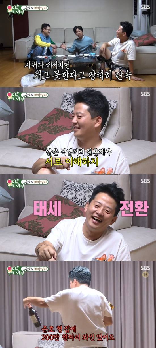김준호는 지상렬이 술을 찾자 "이건 안 된다. 나 지민이랑 마실 거다"라며 선을 그었고, 홍인규는 "준호 형 200만 원짜리 와인 선물 받은 거 있다"라며 귀띔했다.