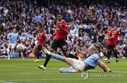 Manchester City's Erling Haaland scores his side's third goal during the English Premier League soccer match between Manchester City and Manchester United at Etihad stadium in Manchester, England, Sunday, Oct. 2, 2022. (Martin Rickett/PA via AP) UNITED KINGDOM OUT; NO SALES; NO ARCHIVE; PHOTOGRAPH MAY NOT BE STORED OR USED FOR MORE THAN 14 DAYS AFTER THE DAY OF TRANSMISSION; MANDATORY CREDIT
