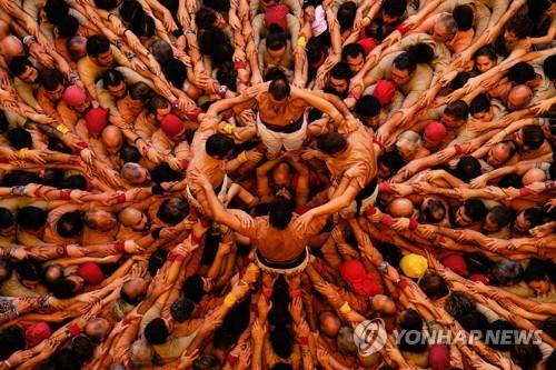 epaselect epa10219397 Members of the 'Colla Xiquets de Reus' team form their 'castell' or human tower during Castells contest's final in Tarragona, Catalonia, Spain, 02 October 2022. The 'castells', human constructions in the form of towers, where each 'casteller' stands on the shoulders of the one below up to a height of between four and ten levels, are included in the list of the Intangible Cultural Heritage of Humanity of the United Nations Educational, Scientific and Cultural Organization (UNESCO). EPA/Enric Fontcuberta