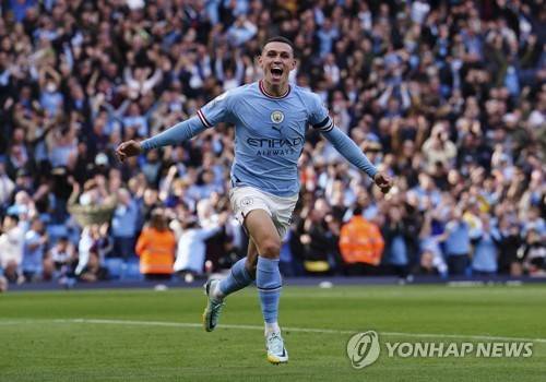 Manchester City's Phil Foden celebrates scoring his side's fourth goal during the English Premier League soccer match between Manchester City and Manchester United at Etihad stadium in Manchester, England, Sunday, Oct. 2, 2022. (Martin Rickett/PA via AP) UNITED KINGDOM OUT; NO SALES; NO ARCHIVE; PHOTOGRAPH MAY NOT BE STORED OR USED FOR MORE THAN 14 DAYS AFTER THE DAY OF TRANSMISSION; MANDATORY CREDIT