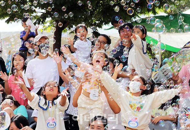 [이데일리 김태형 기자] 연휴기간 중인 2일 오후 전북 완주군 고산면 고산휴양림 일원에서 열리고 있는 '제10회 완주 와일드&로컬푸드축제'를 찾은 어린이들이 버블쇼를 보며 즐거워 하고 있다.