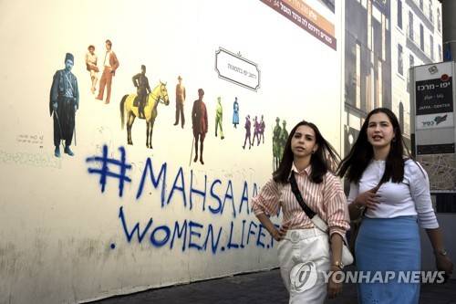 Israeli women stroll past graffiti that reads, "#MahsaAmini - women.life.freedom," in solidarity with Mahsa Amini, a young Iranian woman who died after being arrested in Tehran by Iran's notorious "morality police," on Jaffa Street in central Jerusalem, Sunday, Oct. 2, 2022. (AP Photo/Maya Alleruzzo)