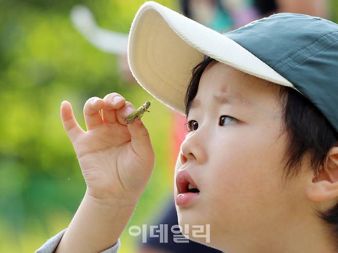 [이데일리 김태형 기자] 연휴기간 중인 2일 오후 전북 완주군 고산면 고산휴양림 일원에서 열리고 있는 '제10회 완주 와일드&로컬푸드축제'를 찾은 한 어린이가 메뚜기잡기 체험에서 잡은 메뚜기를 신기한 듯 바라보고 있다. (사진=완주군)