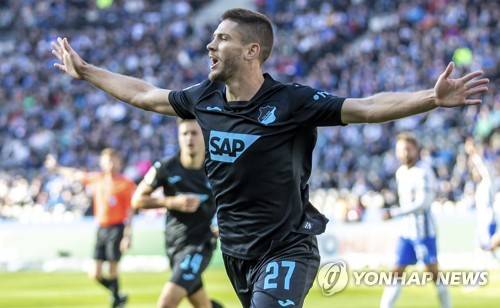 TSG Hoffenheim's Andrej Kramaric celebrates after scoring to 0-1 during the German Bundesliga soccer match between Hertha Berlin and TSG Hoffenheim, at the Berlin Olympic stadium, Sunday, Oct. 2, 2022. (Andreas Gora/dpa via AP) GERMANY OUT; MANDATORY CREDIT