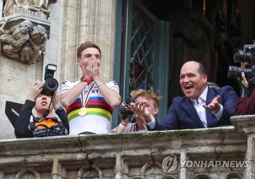epa10219534 World road race champion Remco Evenepoel of Belgium celebrates with fans at the 'Grand Place' in Brussels, Belgium, 02 October 2022. EPA/JULIEN WARNAND
