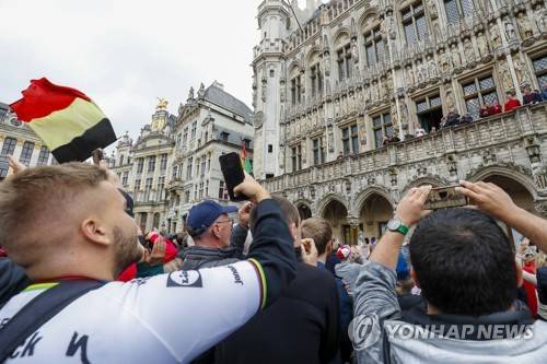 epa10219542 World road race champion Remco Evenepoel (C) of Belgium celebrates with fans at the 'Grand Place' in Brussels, Belgium, 02 October 2022. EPA/JULIEN WARNAND