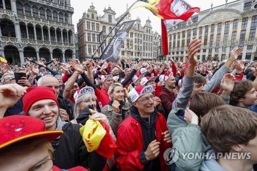epa10219538 World road race champion Remco Evenepoel (unseeen) of Belgium celebrates with fans at the 'Grand Place' in Brussels, Belgium, 02 October 2022. EPA/JULIEN WARNAND