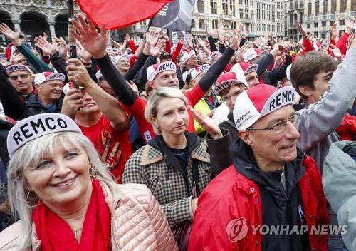 epa10219536 World road race champion Remco Evenepoel (unseeen) of Belgium celebrates with fans at the 'Grand Place' in Brussels, Belgium, 02 October 2022. EPA/JULIEN WARNAND