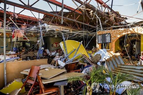 epa10219599 The sun shines in through the open roof of a damaged restaurant in the wake of Hurricane Ian in Daytona Beach Shores, Florida, 02 October 2022. The category 4 storm made land fall 28 September causing widespread damage and power outages. EPA/TANNEN MAURY