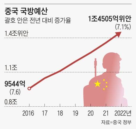 시 주석이 국가주석에 오른 2013년 7200억위안이었던 중국의 국방예산은 올해 2022년 1조4505억위안으로 2배로 증가했다. 시 주석은 “실전에서 이길 수 있는 군대”를 강조하며 군구(軍區), 지원 체계를 대폭 개혁했다. 베이징 외교가에서는 2027년 중국군 창건 100주년 때까지 국방력 강화에 속도를 낼 것으로 보고 있다.