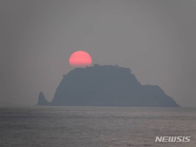 [서귀포=뉴시스] 오영재 기자 = 개천절인 3일 오전 서귀포시 법환동 범섬 뒤로 불그스레한 해가 떠오르고 있다. 2022.10.03 oyj4343@newsis.com