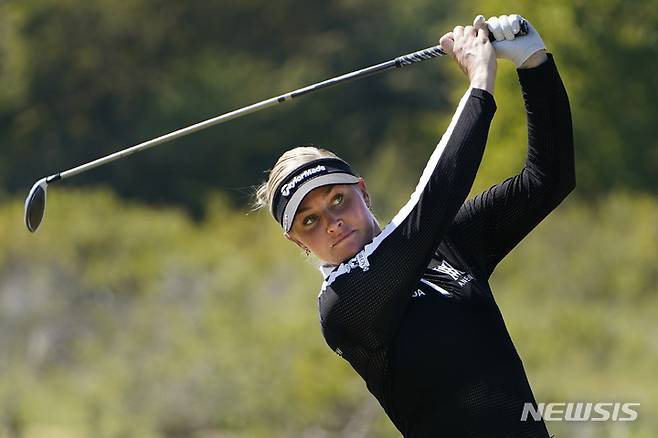 [더콜로니=AP/뉴시스] 찰리 헐(영국)이 2일(현지시간) 미 텍사스주 더콜로니의 올드 아메리칸 GC에서 열린 미국여자프로골프(LPGA) 투어 어센던트 LPGA 최종라운드 8번 홀에서 티샷하고 있다. 헐은 최종 합계 18언더파 266타로 우승, 투어 2승째를 거뒀다. 2022.10.03.