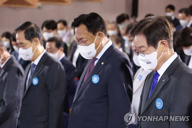 (서울=연합뉴스) 김승두 기자 = 한덕수 국무총리가 3일 정부서울청사에서 열린 개천절 경축식에 참석해 묵념하고 하고 있다. 왼쪽부터 한덕수 국무총리, 국민의힘 정진석 비상대책위원장, 더불어민주당 이재명 대표. 2022.10.3