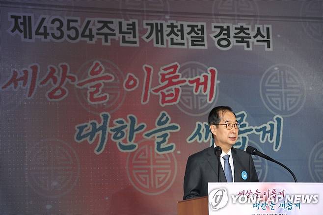(서울=연합뉴스) 김승두 기자 = 한덕수 국무총리가 3일 정부서울청사에서 열린 개천절 경축식에 참석해 경축사를 하고 있다. 2022.10.3