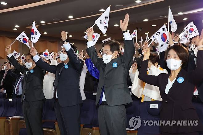 (서울=연합뉴스) 김승두 기자 = 한덕수 국무총리와 참석자들이 3일 정부서울청사에서 열린 개천절 경축식에 참석해 만세삼창을 하고 있다. 2022.10.3