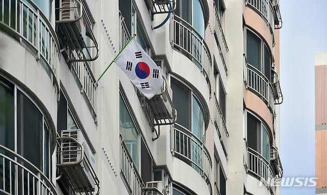 [대구=뉴시스] 이무열 기자 = 제4354주년 개천절인 3일 오전 대구 동구의 한 아파트단지에 태극기가 홀로 게양돼 있다. 2022.10.03. lmy@newsis.com