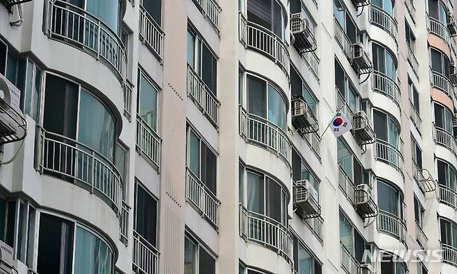 [대구=뉴시스] 이무열 기자 = 제4354주년 개천절인 3일 오전 대구 동구의 한 아파트단지에 태극기가 홀로 게양돼 있다. 2022.10.03. lmy@newsis.com